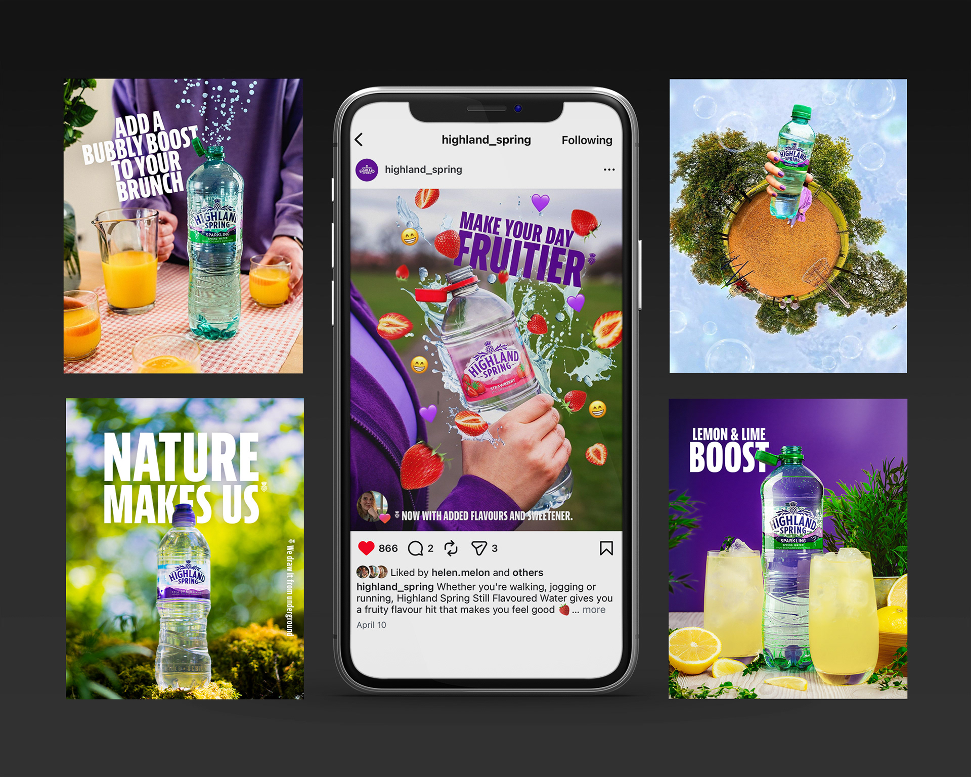 Boosting the launch of Highland Spring's 'Water As Nature Intended' position, by making their bottles larger than life in a natural setting. Through social posts, videos and animations to help bolster their position online and across wider audiences.